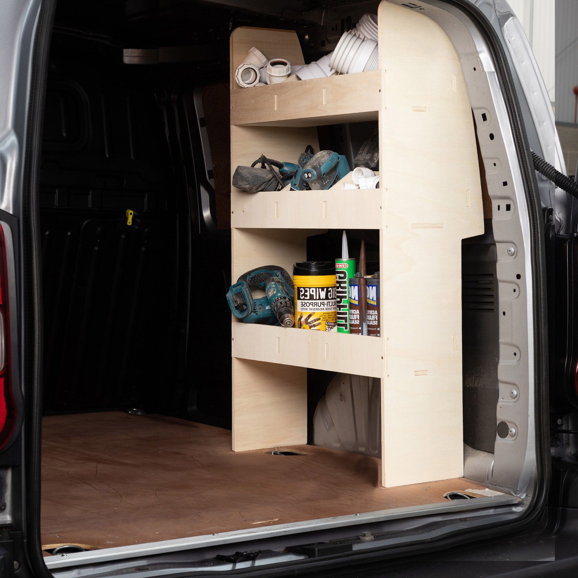 Transporter-Regalsystem für Ford Transit Connect aus 12 mm Pappelsperrholz. Diese Laderaumeinrichtung besteht aus einem modularen Regal, das auf die Fahrerseite des Vans passt und ist speziell für den professionellen Einsatz im Kastenwagen gefertigt. Stabil, leicht und schnell montiert – ideal für Handwerker und Servicetechniker.