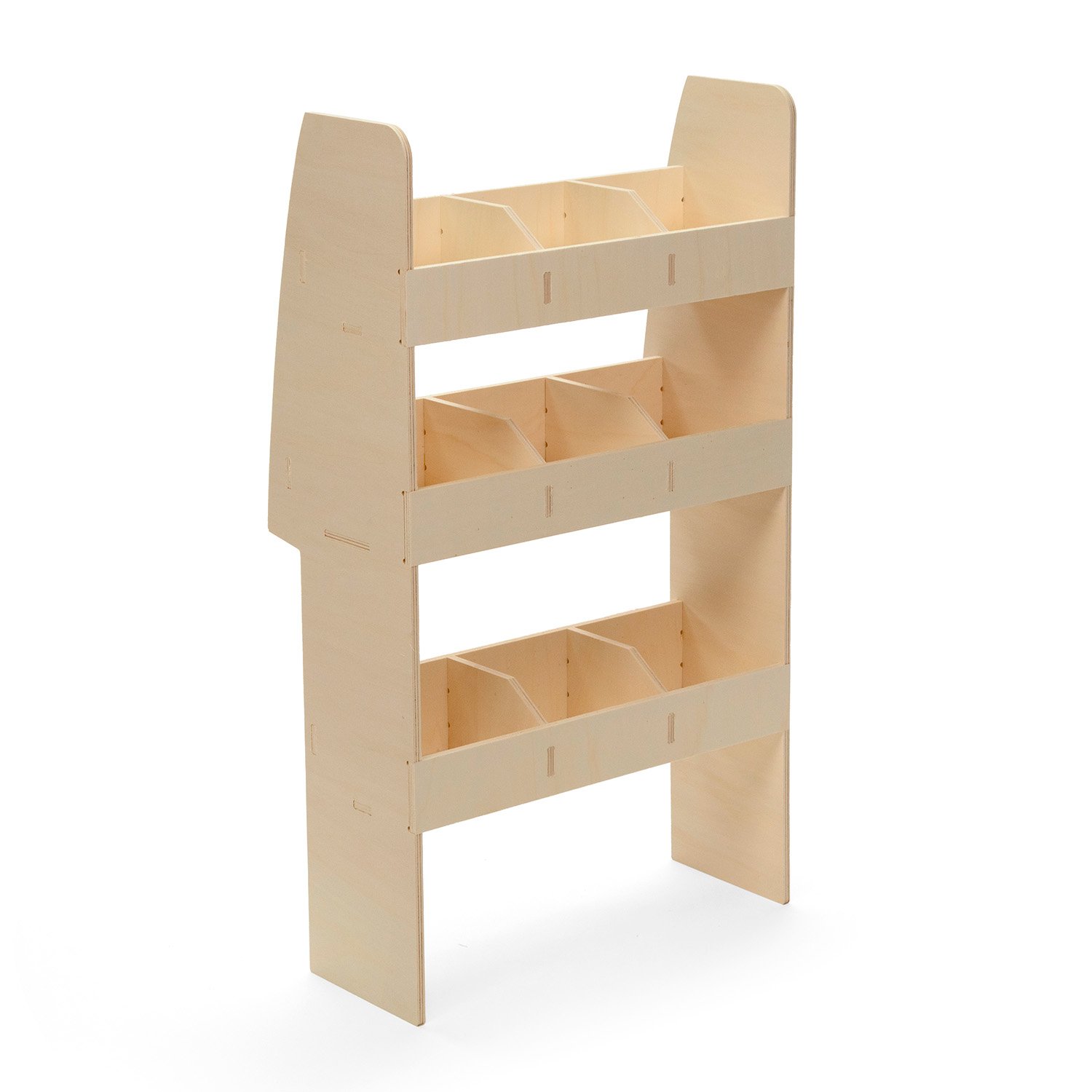 Dieses Regalsystem ist mit Zapfen- und Schlitzverbindungen sowie ineinandergreifenden Fachböden ausgestattet, um eine hohe Stabilität und Passgenauigkeit zu gewährleisten.