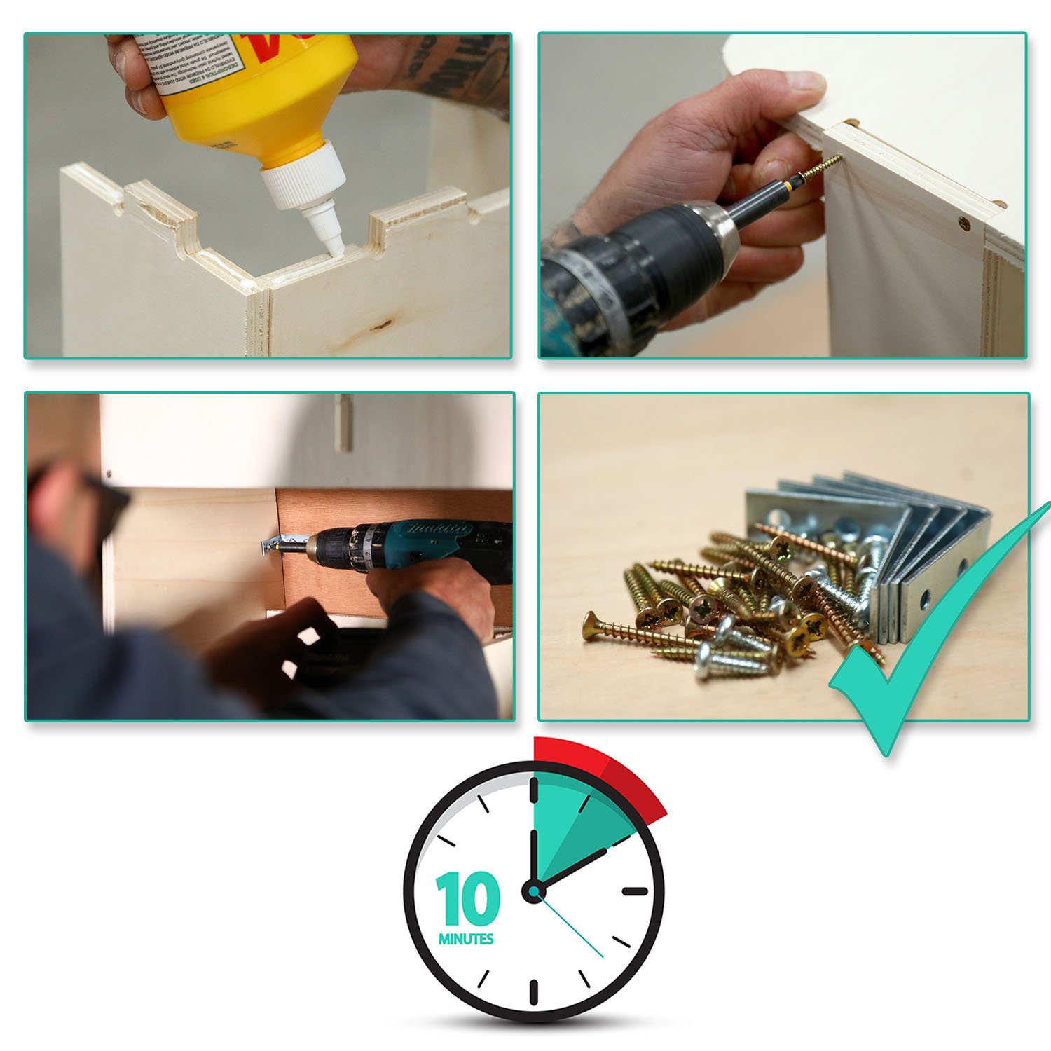 Das Produkt wird zerlegt als Bausatz geliefert, um den Versand zu erleichtern. Inklusive aller benötigten Schrauben und Halterungen sowie einer klaren, leicht verständlichen Montageanleitung. Eine kleine Menge Holzleim (nicht im Lieferumfang enthalten) kann optional zusätzlich verwendet werden. Geschätzte Aufbauzeit pro Einheit: ca. 10 Minuten.