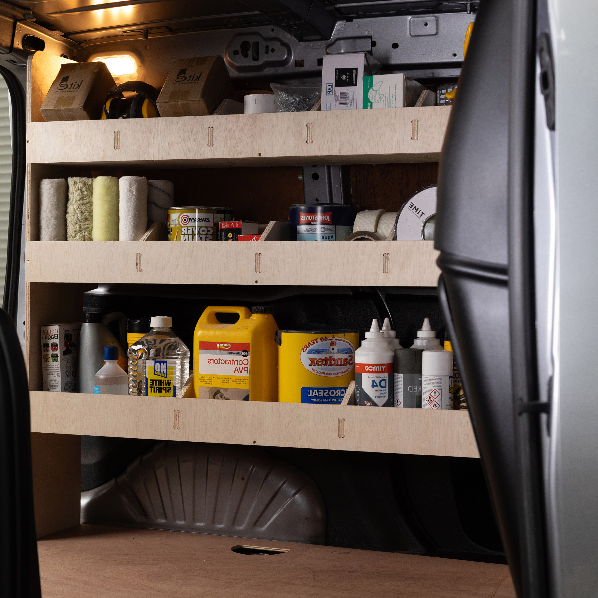 Unsere Regale wurden speziell für die Seitenkonturen eines Kangoo L1 2022+ -Vans entwickelt und erhöhen die Lagerkapazität Ihres Vans, ohne die Stellfläche zu beeinträchtigen.